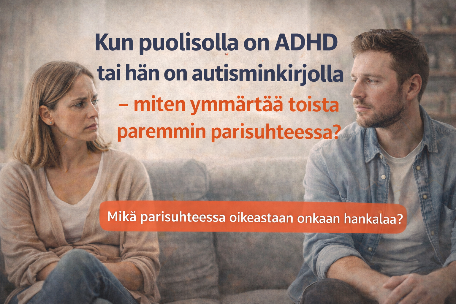 Parisuhteessa jokainen tuo mukanaan oman tapansa ajatella, tuntea ja toimia. Kun toisella puolisolla on ADHD tai hän on autisminkirjolla, arki voi joskus tuntua haastavalta. Väärinymmärrykset, erilaiset tarpeet ja erilainen tapa käsitellä tunteita voivat aiheuttaa konflikteja, vaikka molemmat välittäisivät toisistaan paljon.