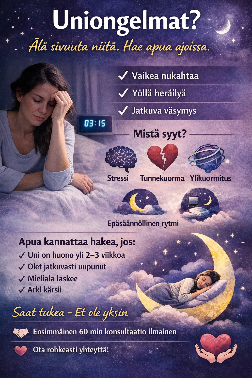 Jos koet, että uniongelmat vaikuttavat arkeesi, jaksamiseesi tai vanhemmuuteesi:
