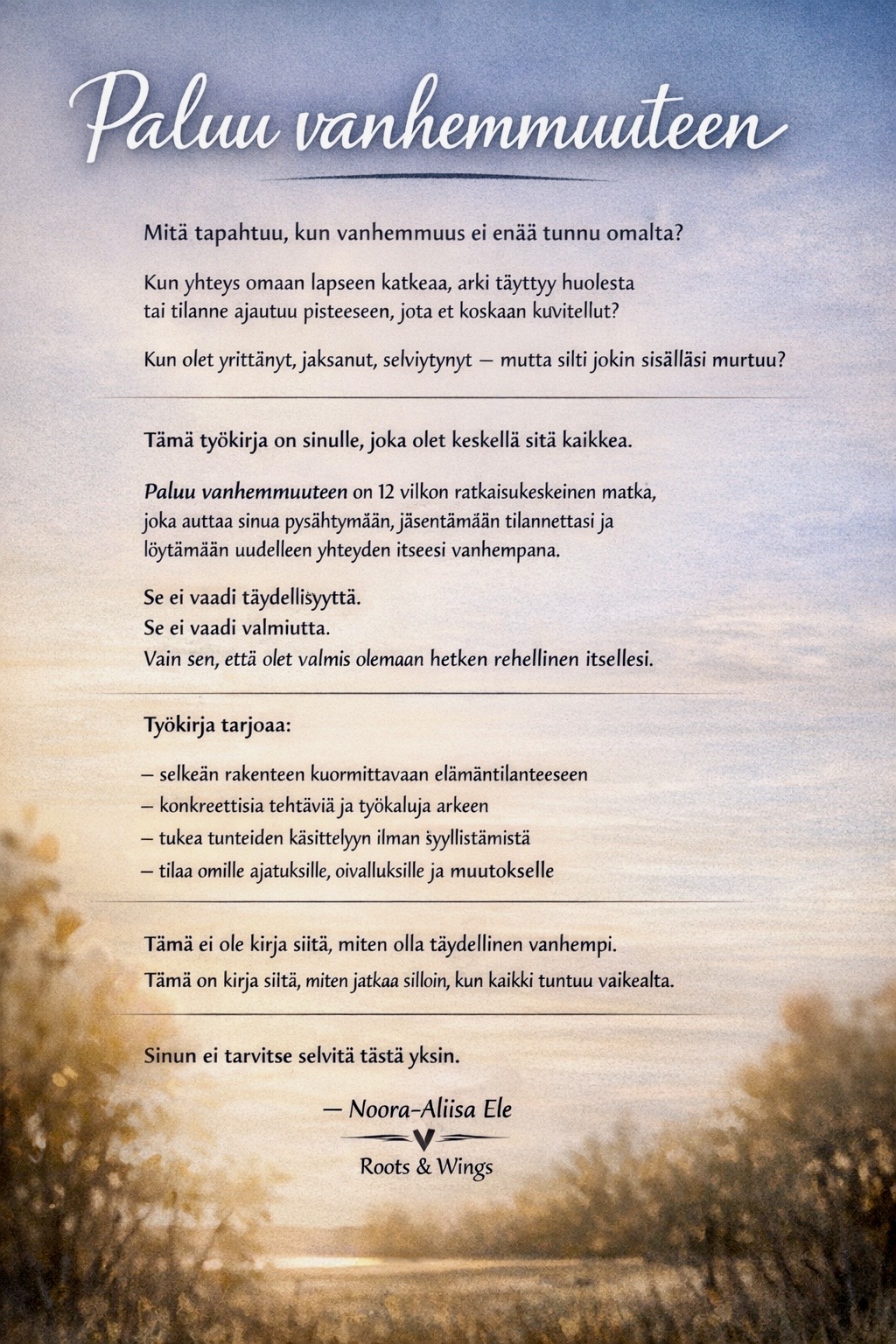 Paluu vanhemmuuteen on 12 viikon ratkaisukeskeinen matka, joka auttaa sinua pysähtymään, jäsentämään tilannettasi ja löytämään uudelleen yhteyden itseesi vanhempana.